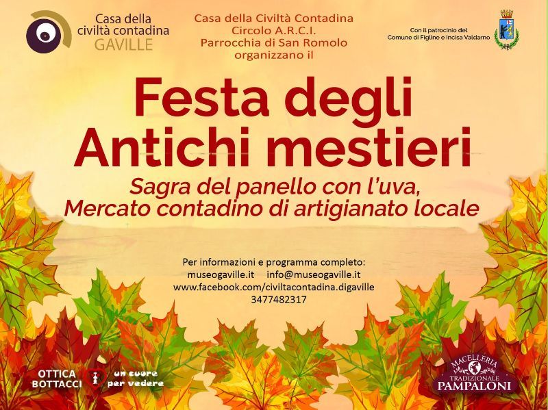 Sabato 4 e Domenica 5 Ottobre a Gaville, presso l'antica pieve, torna la festa della civiltà contadina, accompagnata dalla sagra del panello con l'uva, il Mercato contadino di artigianato locale e molto altro ancora.