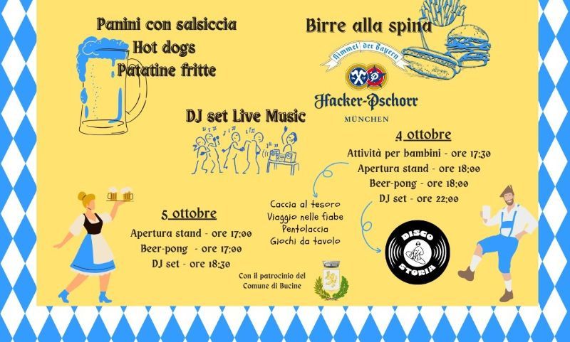 Inseme alle Birre originali Hacker-Pschorr le giornate saranno accompagnate da DJ set e live music, Panini con salsiccia, hot dog e patatine fritte; in oltre Giochi popolari: tiro alla fune, calcio tennis, beer pong, e per i più piccoli letture animate, attività per bambini e tanto divertimento!