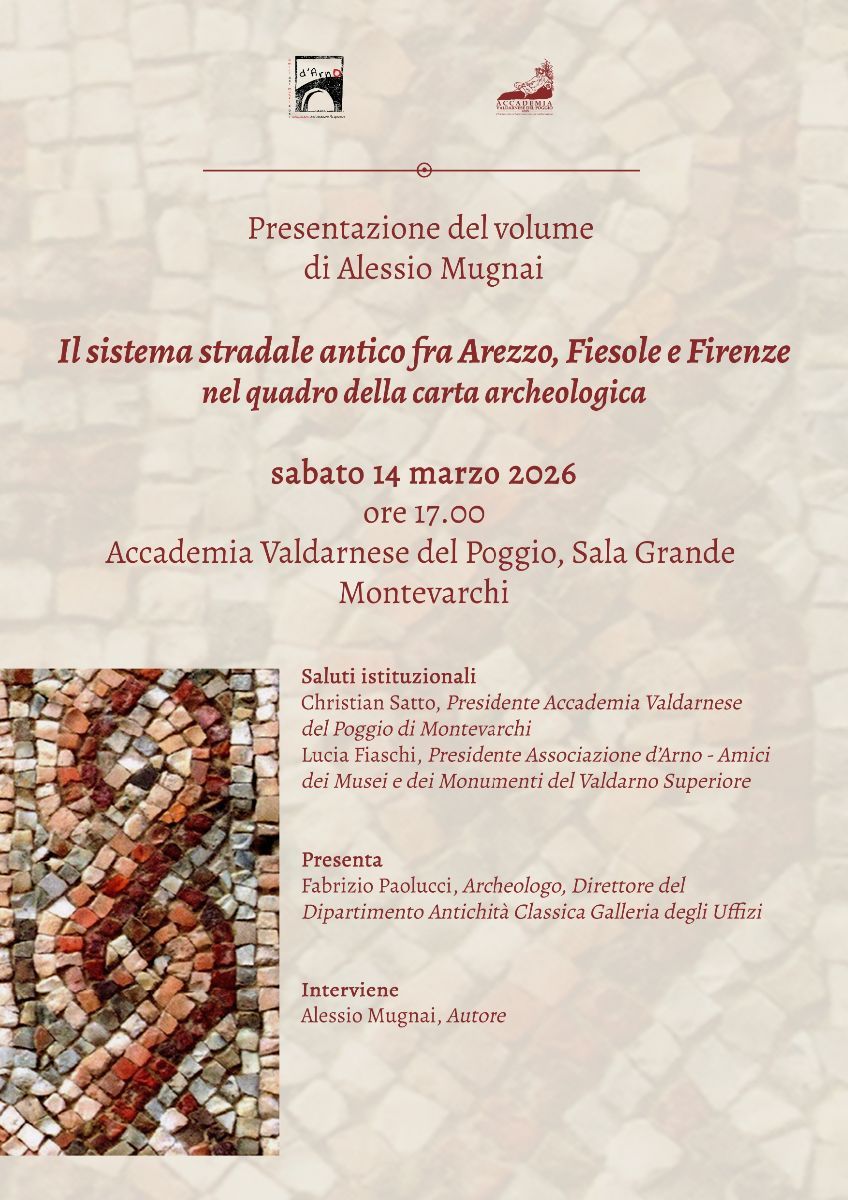 Dopo il successo del primo appuntamento di gennaio a Palazzo Concini di Terranuova Bracciolini, avremo il piacere di presentare il libro di Alessio Mugnai, Il sistema stradale antico fra Arezzo, Fiesole e Firenze nel quadro della carta archeologica, nella Sala Grande dell’Accademia Valdarnese del Poggio sabato 14 marzo alle ore 17:00, alla presenza dell’autore e di Fabrizio Paolucci (Archeologo,