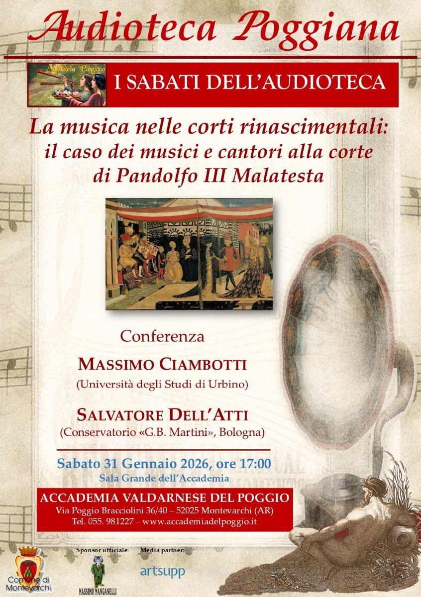 Sabato 31 gennaio, alle ore 17:00 nella Sala Grande dell’Accademia Valdarnese del  Poggio di Montevarchi, si terrà la prima conferenza del 2026 de "I Sabati dell'Audioteca": Massimo Ciambotti (Professore dell’Università degli Studi di Urbino) e Salvatore Dell'Atti (Direttore d’orchestra, Compositore e Musicologo) parleranno di musici e cantori nel Rinascimento, con particolare attenzione alla corte di Pandolfo III Malatesta.