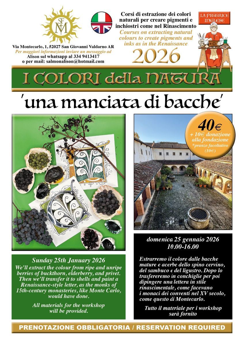 Domenica 25 Gennaio dalle ore 10.00 alle ore 16.00, presso il Convento di Montecarlo, San Giovanni Valdarno, l'occasione per riscoprire antiche pratiche e tradizioni, estraendo il colore dalle bacche mature e acerbe dello spino cervino, del sambuco e del ligustro.